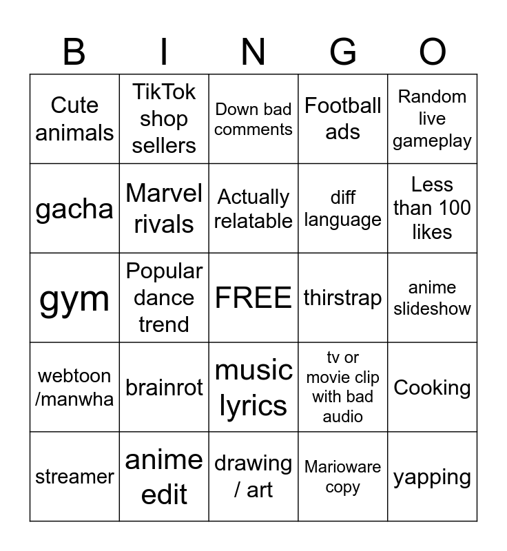 This bingo card has a free space and 29 words: streamer, Podcast clip, Popular dance trend, reddit story, Cute animals, Down bad comments, Marvel rivals, brainrot, thirstrap, anime edit, anime slideshow, yapping, drawing / art, Marioware copy, Less than 100 likes, nostalgic tiktok, music lyrics, webtoon /manwha, Random live gameplay, gym, tv or movie clip with bad audio, old person, diff language, gacha, Football ads, TikTok shop sellers, Cooking, Actually relatable and “💔💔💔” Comment.