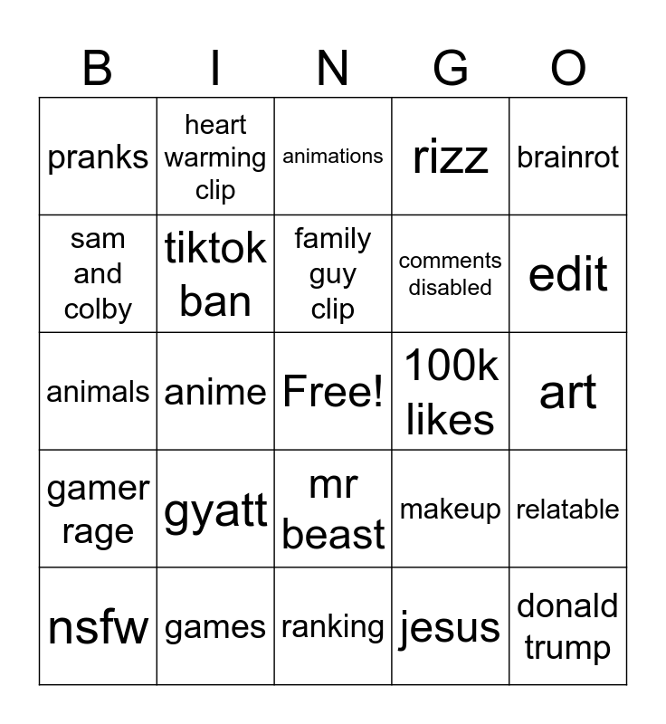 This bingo card has a free space and 24 words: gyatt, games, family guy clip, nsfw, brainrot, pranks, sam and colby, heart warming clip, 100k likes, mr beast, comments disabled, animals, makeup, relatable, tiktok ban, jesus, art, animations, edit, anime, donald trump, gamer rage, rizz and ranking.