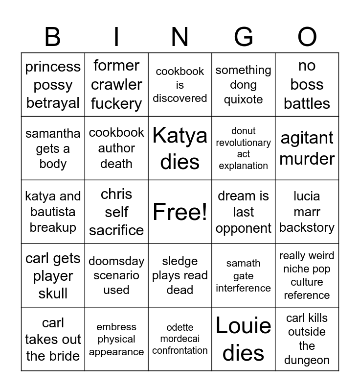 This bingo card has a free space and 24 words: carl takes out the bride, doomsday scenario used, Katya dies, Louie dies, no boss battles, princess possy betrayal, former crawler fuckery, cookbook is discovered, dream is last opponent, lucia marr backstory, katya and bautista breakup, cookbook author death, samath gate interference, really weird niche pop culture reference, samantha gets a body, embress physical appearance, odette mordecai confrontation, something dong quixote, agitant murder, carl gets player skull, chris self sacrifice, sledge plays read dead, donut revolutionary act explanation and carl kills outside the dungeon.