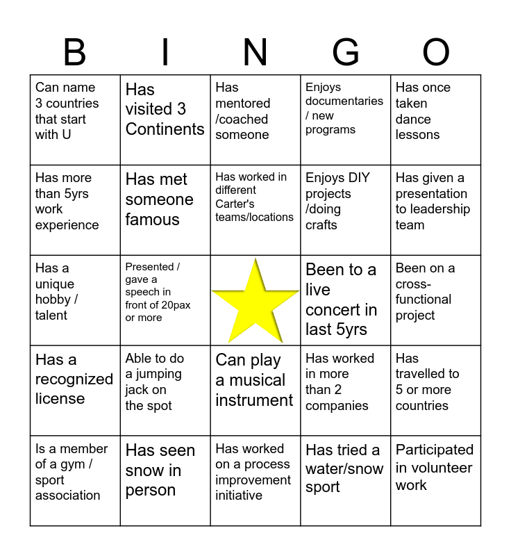 This bingo card has a free space and 24 words: Able to do a jumping jack on the spot, Has seen snow in person, Has worked in different Carter's teams/locations, Is a member of a gym / sport association, Has once taken dance lessons, Can name 3 countries that start with U, Has more than 5yrs work experience, Has visited 3 Continents, Been to a live concert in last 5yrs, Can play a musical instrument, Enjoys DIY projects /doing crafts, Has a unique hobby / talent, Has worked in more than 2 companies, Has travelled to 5 or more countries, Has met someone famous, Has tried a water/snow sport, Been on a cross-functional project, Has mentored /coached someone, Has given a presentation to leadership team, Presented / gave a speech in front of 20pax or more, Participated in volunteer work, Has a recognized license, Enjoys documentaries / new programs and Has worked on a process improvement initiative.