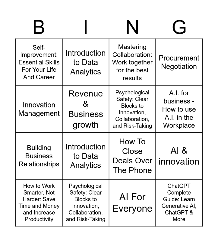 This bingo card has 121 words: Revenue & Business growth, Solution Sales, Storytelling to Speed Up Your Sales Cycle, Sales Skills Training: Consultative Selling Master Class, Business Development: Grow With Strategic Relationships, How To Close Deals Over The Phone, Procurement Negotiation, Successful Negotiation: Essential Strategies and Skills, Relationship management, Customer Service, Customer Support, And Customer Experience, Building Business Relationships, Mastering Collaboration: Work together for the best results, Building Business Relationships, Self-management and collective mind, Project Management Simplified, How to Work Smarter, Not Harder: Save Time and Money and Increase Productivity, How to Be an Adaptable Employee during Change and Uncertainty, Self-Improvement: Essential Skills For Your Life And Career, Mindset Makeover Training (Powerful Techniques & Meditation), Financial Planning & Analysis: Building a Company's Budget, Workplace Communication: You Can Speak Up at Meetings!, Mastering Collaboration: Work together for the best results, Development and Technology, ChatGPT Enterprise: Advanced Features, AI For Everyone, ChatGPT Complete Guide: Learn Generative AI, ChatGPT & More, Cloud Computing With Amazon Web Services, Generative AI for Business Leaders, Clojure Fundamentals For Beginners, Strategic Management, AI Programming with Python Nanodegree Program, AI & innovation, A.I. for business - How to use A.I. in the Workplace, ChatGPT Intermediate - Learn ChatGPT Prompts, Innovation Management, A.I. for business - How to use A.I. in the Workplace, Leadership, Leading and Working in Teams, Inclusive Leadership (2022), Daniel Pink on Motivation, Strategic Thinking, Psychological Safety: Clear Blocks to Innovation, Collaboration, and Risk-Taking, Dan Ariely on Making Decisions, Succeeding in a New Role By Managing Up, Coaching Skills for Leaders and Managers, Daniel Pink on Motivation, Strategic Thinking, Psychological Safety: Clear Blocks to Innovation, Collaboration, and Risk-Taking, Leading and Working in Teams, Communication and presentation, Write Better Emails: Tactics for Smarter Team Communication, Storytelling for Business, Presentation Skills : The Complete Guide, Communication Foundations, Write Better Emails: Tactics for Smarter Team Communication, Storytelling for Business, Presentation Skills : The Complete Guide, Communication Foundations, Measurement and analytics, Introduction to Data Analytics, The Complete Google Sheets Course: Beginner to Advanced!, All about KPIs, Google Sheets - The Comprehensive Masterclass, Master your Decision Making and Critical Thinking Skills !, Doing more with Google Sheets, Revenue & Business growth, Solution Sales, Storytelling to Speed Up Your Sales Cycle, Sales Skills Training: Consultative Selling Master Class, Business Development: Grow With Strategic Relationships, How To Close Deals Over The Phone, Procurement Negotiation, Successful Negotiation: Essential Strategies and Skills, Relationship management, Customer Service, Customer Support, And Customer Experience, Building Business Relationships, Mastering Collaboration: Work together for the best results, Self-management and collective mind, Project Management Simplified, How to Work Smarter, Not Harder: Save Time and Money and Increase Productivity, How to Be an Adaptable Employee during Change and Uncertainty, Self-Improvement: Essential Skills For Your Life And Career, Mindset Makeover Training (Powerful Techniques & Meditation), Financial Planning & Analysis: Building a Company's Budget, Workplace Communication: You Can Speak Up at Meetings!, Mastering Collaboration: Work together for the best results, Development and Technology, ChatGPT Enterprise: Advanced Features, AI For Everyone, ChatGPT Complete Guide: Learn Generative AI, ChatGPT & More, Cloud Computing With Amazon Web Services, Generative AI for Business Leaders, Clojure Fundamentals For Beginners, Strategic Management, AI Programming with Python Nanodegree Program, AI & innovation, A.I. for business - How to use A.I. in the Workplace, ChatGPT Intermediate - Learn ChatGPT Prompts, Innovation Management, Leadership, Leading and Working in Teams, Inclusive Leadership (2022), Daniel Pink on Motivation, Strategic Thinking, Psychological Safety: Clear Blocks to Innovation, Collaboration, and Risk-Taking, Dan Ariely on Making Decisions, Succeeding in a New Role By Managing Up, Coaching Skills for Leaders and Managers, Leading and Working in Teams, Communication and presentation, Write Better Emails: Tactics for Smarter Team Communication, Storytelling for Business, Presentation Skills : The Complete Guide, Communication Foundations, Measurement and analytics, Introduction to Data Analytics, The Complete Google Sheets Course: Beginner to Advanced!, All about KPIs, Google Sheets - The Comprehensive Masterclass, Master your Decision Making and Critical Thinking Skills ! and Doing more with Google Sheets.