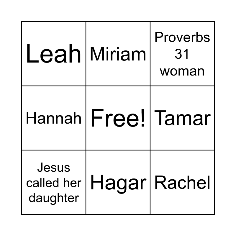 This bingo card has a free space and 26 words: Eve, Sarah, Hagar, Rebekah, Rachel, Leah, Tamar, Miriam, Rahab, Deborah, Jael, Ruth, Naomi, Esther, Elizabeth, Mary, mother of Jesus, Hannah, Bathsheba, Proverbs 31 woman, Huldah, Mary, sister of Martha, Martha, The faithful women of Luke 8, The woman at the well, Jesus called her daughter and Anna.