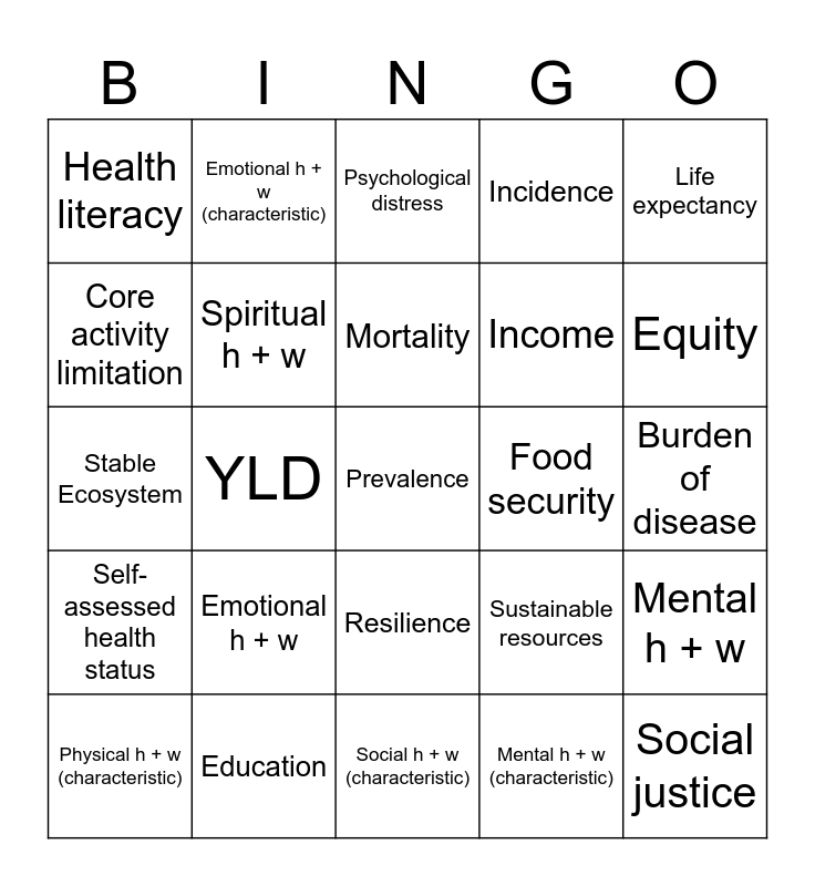 This bingo card has 37 words: Free!, Physical h + w, Social h + w, Spiritual h + w, Mental h + w, Emotional h + w, Mortality, Morbidity, Life expectancy, YLL, YLD, Incidence, Prevalence, Burden of disease, Core activity limitation, Self-assessed health status, Rates of hospitilisation, Psychological distress, Resilience, Food security, Health literacy, Equity, Physical h + w (characteristic), Social h + w (characteristic), Spiritual h + w (characteristic), Mental h + w (characteristic), Emotional h + w (characteristic), Health status, Health indicators, Peace, Shelter, Education, Stable Ecosystem, Social justice, Sustainable resources, Income and Food.