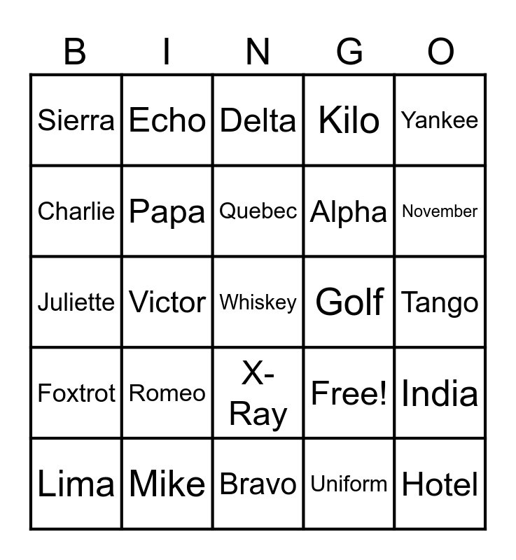 This bingo card has 27 words: Free!, Hotel, Alpha, Bravo, Charlie, Delta, Echo, Foxtrot, Golf, India, Juliette, Kilo, Lima, Mike, November, Oscar, Papa, Quebec, Romeo, Sierra, Tango, Uniform, Victor, Whiskey, X-Ray, Yankee and Zulu.