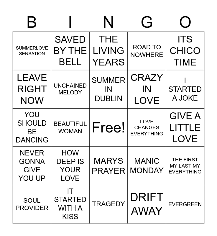 This bingo card has a free space and 44 words: MY SWEET LORD, EVERGREEN, THE TIDE IS HIGH, SOUL PROVIDER, LETS DANCE, DRIFT AWAY, THE LIVING YEARS, JUST THE WAY YOU ARE, ITS CHICO TIME, IT STARTED WITH A KISS, ROAD TO NOWHERE, LOVE CHANGES EVERYTHING, MARYS PRAYER, HOW DEEP IS YOUR LOVE, HEARTBREAKER, TRAGEDY, NEW YORK MINING DISASTER, YOU SHOULD BE DANCING, FIRST OF MAY, I STARTED A JOKE, SAVED BY THE BELL, TO LOVE SOMEBODY, BE MY BABY, SUMMERLOVE SENSATION, SHANG A LANG, GIVE A LITTLE LOVE, WALK LIKE AN EGYPTION, ETERNAL FLAME, MANIC MONDAY, NEVER GONNA GIVE YOU UP, LET THE MUSIC PLAY, THE FIRST MY LAST MY EVERYTHING, ALL MY LOVING, ROLL OVER BEETHOVEN, BEAUTIFUL WOMAN, PLEASE MR POSTMAN, UNBREAKABLE, IS IT RAINING IN PARIS TONIGHT, SUMMER IN DUBLIN, LEAVE RIGHT NOW, CRAZY IN LOVE, IF TOMORROW NEVER COMES, UNCHAINED MELODY and WORLD OF OUR OWN.