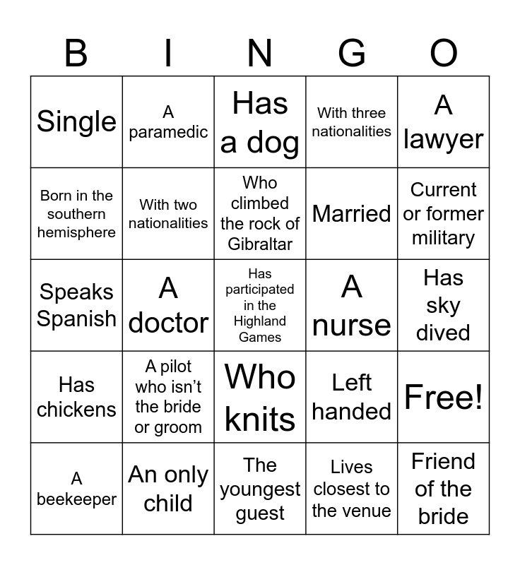 This bingo card has 51 words: Is Vice President of a Pole Dancing Society, Has participated in the Highland Games, Has travelled the furthest to get here, The youngest guest, A pilot who isn’t the bride or groom, A police officer, A paramedic, A journalist, Born in the southern hemisphere, Has lived in three or more countries, With two nationalities, With three nationalities, Free!, Left handed, A train driver, In a kilt, Who climbed the rock of Gibraltar, A nurse, A teacher, A lawyer, A doctor, Lives closest to the venue, Single, Married, Friend of the groom, Friend of the bride, Current or former military, Two people with the same birthday, A beekeeper, Has a dog, The couple who has been married the longest, Shares a name with someone famous, Vegetarian, Who was on TV, With three or more siblings, An only child, A twin, A model, Owns a classic car, Plays golf, Has sky dived, Has chickens, Doesn’t like cheese, Has tattoos, The couple who got married most recently, The next couple to get married, Speaks Spanish, Speaks German, Teaches yoga, Who knits and Owns a camper van.