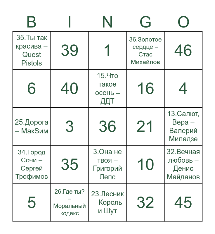 This bingo card has 90 words: 1, 2.Песня про зайцев – Юрий Никулин, 3.Она не твоя – Григорий Лепс, 4.Роман – Винтаж, 5.Если в сердце живет любовь – Юлия Савичева, 6.Пошлю его на … - Лолита, 7.Ты неси меня река – Любэ, 8.Зима в сердце – Гости из будущего, 9.Самба белого мотылька – Валерий Меладзе, 10.Кончится лето – КИНО, 11.Полковнику никто не пишет – БИ-2, 12.Девушка по городу – Ю-питер, 19.Я свободен – Кипелов, 13.Салют, Вера – Валерий Миладзе, 14.140 – IOWA, 15.Что такое осень – ДДТ, 16.Вахтёрам – Бумбокс, 17.Мы желаем счастья вам – Цветы, 18.Батарейка – Жуки, 20.Лирика – Сектор Газа, 21.Группа крови – КИНО, 22.Матушка – Татьяна Куртукова, 23.Лесник – Король и Шут, 24.Ночь на кухне – ANNA ASTI, 25.Дорога – МакSим, 26.Где ты? – Моральный кодекс, 27.Раневская – Лолита, 28.Хали-Гали, паратрупер – Леприконсы, 29.По барам – ANNA ASTI, 30.Между нами любовь – SEREBRO, 31.Чистый лист – НЭНСИ, 32.Вечная любовь – Денис Майданов, 33.Невеста? – Мумий Тролль, 34.Город Сочи – Сергей Трофимов, 35.Ты так красива – Quest Pistols, 36.Золотое сердце – Стас Михайлов, 1, 2, 3, 4, 5, 6, 7, 8, 9, 10, 11, 12, 13, 14, 15, 16, 17, 18, 19, 20, 21, 22, 23, 24, 25, 26, 27, 28, 29, 30, 31, 32, 33, 34, 35, 36, 37, 38, 39, 40, 41, 42, 43, 44, 45, 46, 47, 48, 49, 50, 51, 52, 53 and 54.