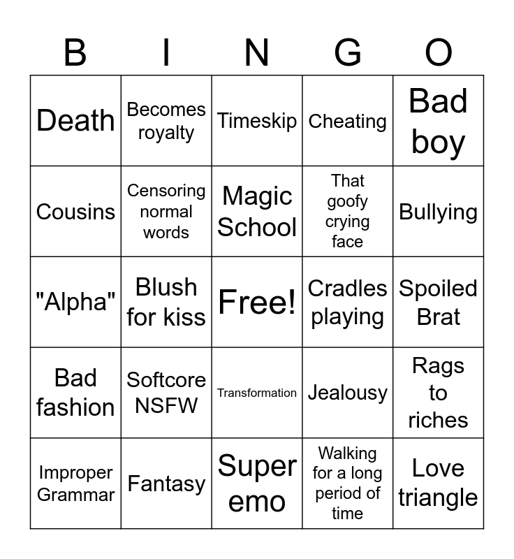 This bingo card has a free space and 29 words: Improper Grammar, Abused, Blush for kiss, Fetish, Death, Timeskip, Censoring normal words, Softcore NSFW, Cradles playing, Fantasy, Spoiled Brat, Love triangle, Super emo, Walking for a long period of time, Bullying, Dialog too fast, Transformation, Bad fashion, Bad boy, "Alpha", Jealousy, "I'm not like the other girls!!!", That goofy crying face, Cousins, Cheating, Becomes royalty, Rags to riches, Magic School and Angel x devil.