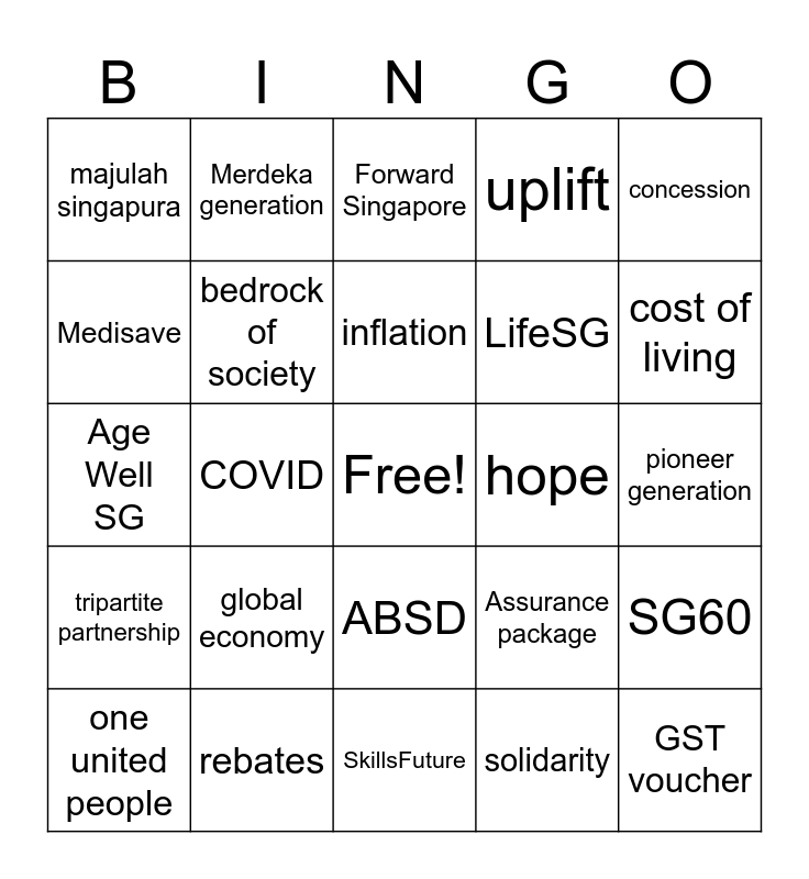 This bingo card has a free space and 27 words: Assurance package, CPF, LifeSG, SkillsFuture, Medisave, Forward Singapore, Merdeka generation, tripartite partnership, hope, SG60, Age Well SG, uplift, one united people, rebates, cost of living, majulah package, bedrock of society, inflation, global economy, majulah singapura, pioneer generation, solidarity, COVID, GST voucher, ABSD, concession and MINDEF.
