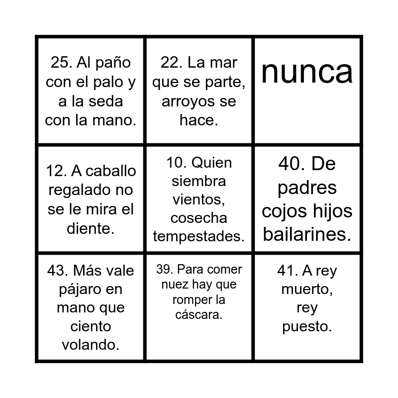 This bingo card has 43 words: mujer, barriga, dicho, ayuda, dime, caballo, nunca, mal, 10. Quien siembra vientos, cosecha tempestades., 11. A quien madruga Dios lo ayuda., 12. A caballo regalado no se le mira el diente., 13. Genio y figura hasta la sepultura., 14. A quien Dios se lo da, San Pedro se lo bendiga., 15. A camarón que se duerme se lo lleva la corriente., 16. Dime con quién andas y te diré quién eres., 17. Quien mal anda, mal acaba., 18. En río revuelto, ganancia de perdedores., 19. A Dios rogando y con el maso dando., 20. Más sabe el loco en su tasa, que el cuerdo en la ajena., 21. Una onza de buena fama vale más que una libra de perlas., 22. La mar que se parte, arroyos se hace., 23. Lo que no va en lágrimas, va en suspiros, 24. Quien no da migas no tiene amigas., 25. Al paño con el palo y a la seda con la mano., 26. Más vale una toma, que dos te daré., 27. Ni tan cerca del sol que arda, ni tan lejos que le dé frío., 28. A buen entendedor pocas palabras., 29. A palabras necias oídos sordos., 30. De tal palo tal astilla., 31. Para gallo sin traba, todo terreno es su cancha., 32. En casa del herrero cuchillo de palo., 33. No por mucho madrugar se amanece más temprano., 34. Quien bien te quiere te hará llorar,, 35. Al amigo y al caballo, no cansarlo ni apretarlo., 36. Quien viste con ropa ajena, en la calle lo desvisten., 37. Gran victoria la que sin sangre se toma., 38. En cojera de perros y en lágrimas de mujer no hay que creer., 39. Para comer nuez hay que romper la cáscara., 40. De padres cojos hijos bailarines., 41. A rey muerto, rey puesto., 42. No menciones la soga en casa del ahorcado., 43. Más vale pájaro en mano que ciento volando. and 44. Más sabe el diablo por viejo que por diablo.