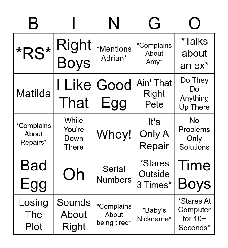 This bingo card has a free space and 24 words: Oh, Sounds About Right, Good Egg, Losing The Plot, *Talks about an ex*, *RS*, Matilda, Right Boys, It's Only A Repair, Serial Numbers, Ain' That Right Pete, *Complains About Repairs*, *Stares Outside 3 Times*, Time Boys, I Like That, *Baby's Nickname*, No Problems Only Solutions, *Mentions Adrian*, Do They Do Anything Up There, While You're Down There, *Stares At Computer for 10+ Seconds*, Bad Egg, *Complains About Amy* and *Complains About being tired*.