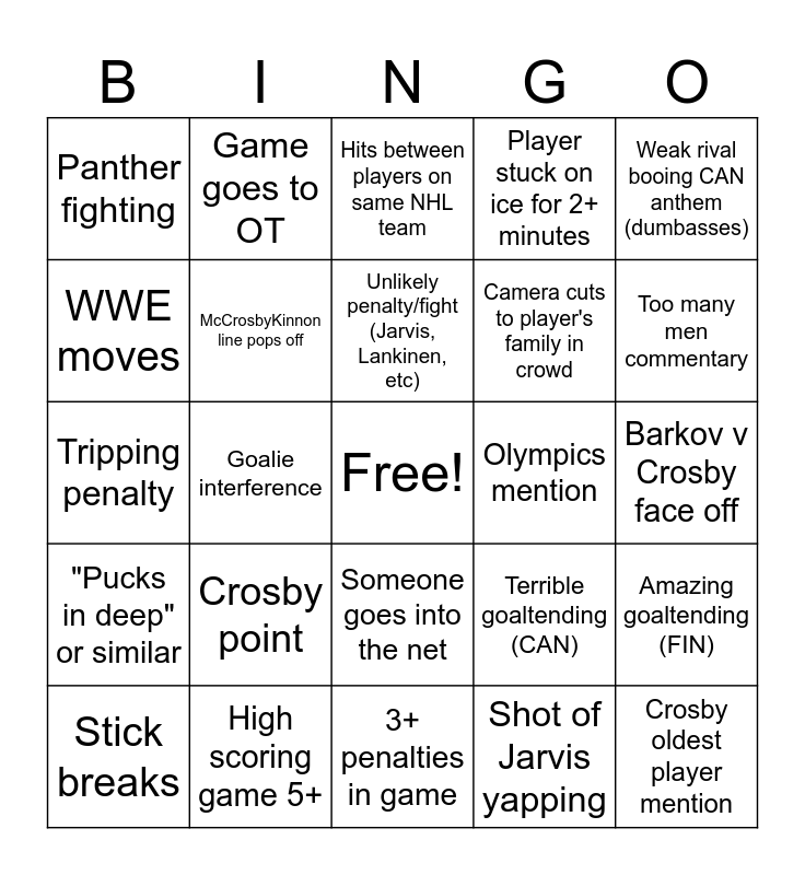 This bingo card has a free space and 24 words: Crosby point, High scoring game 5+, Unlikely penalty/fight (Jarvis, Lankinen, etc), Stick breaks, Weak rival booing CAN anthem (dumbasses), Panther fighting, WWE moves, Game goes to OT, Olympics mention, Someone goes into the net, Camera cuts to player's family in crowd, Tripping penalty, Terrible goaltending (CAN), Amazing goaltending (FIN), McCrosbyKinnon line pops off, Shot of Jarvis yapping, Barkov v Crosby face off, Hits between players on same NHL team, Too many men commentary, Goalie interference, Crosby oldest player mention, "Pucks in deep" or similar, Player stuck on ice for 2+ minutes and 3+ penalties in game.