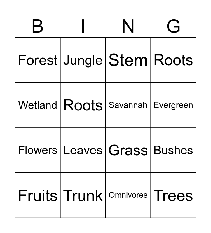 This bingo card has 16 words: Trunk, Bushes, Stem, Forest, Flowers, Jungle, Grass, Omnivores, Wetland, Roots, Fruits, Roots, Leaves, Evergreen, Savannah and Trees.