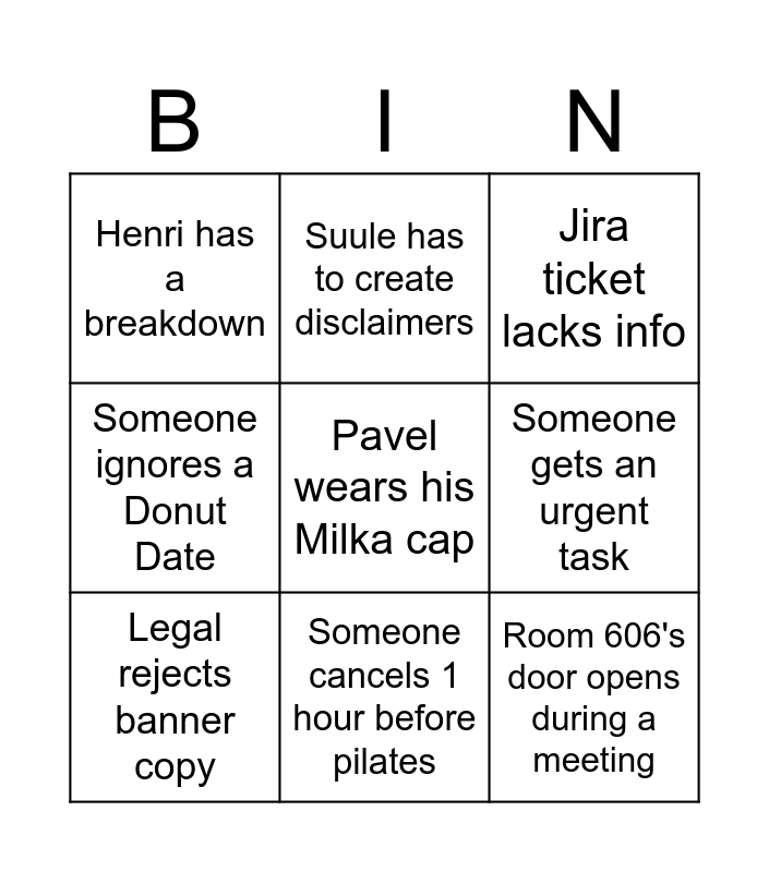 This bingo card has a free space and 8 words: Someone gets an urgent task, Jira ticket lacks info, Suule has to create disclaimers, Legal rejects banner copy, Henri has a breakdown, Room 606's door opens during a meeting, Someone ignores a Donut Date and Someone cancels 1 hour before pilates.