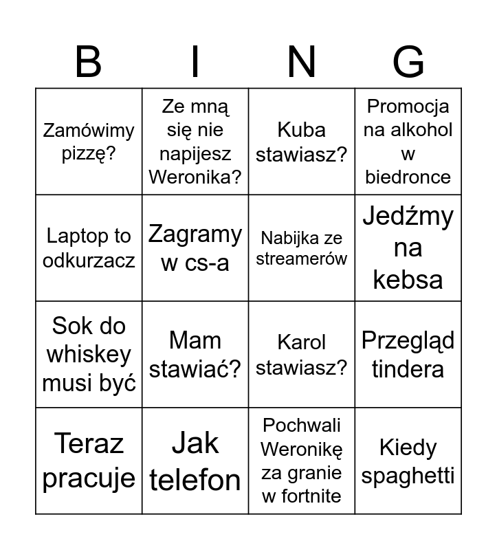 This bingo card has 16 words: Jak telefon, Przegląd tindera, Kuba stawiasz?, Zamówimy pizzę?, Sok do whiskey musi być, Ze mną się nie napijesz Weronika?, Karol stawiasz?, Pochwali Weronikę za granie w fortnite, Laptop to odkurzacz, Zagramy w cs-a, Teraz pracuje, Promocja na alkohol w biedronce, Mam stawiać?, Jedźmy na kebsa, Nabijka ze streamerów and Kiedy spaghetti.