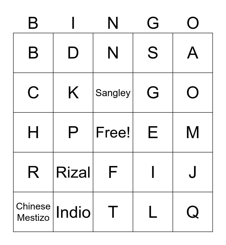 This bingo card has a free space and 24 words: Rizal, Indio, Sangley, Chinese Mestizo, A, B, C, D, E, F, G, H, I, J, K, L, M, N, O, P, Q, R, S and T.