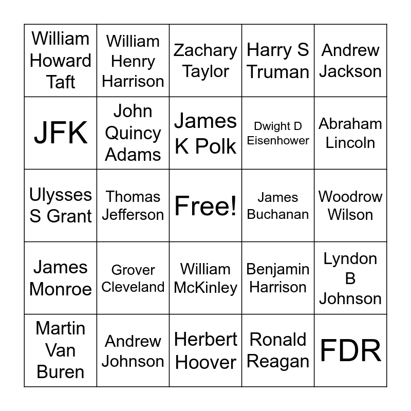 This bingo card has a free space and 33 words: George Washington, John Adams, Thomas Jefferson, James Madison, James Monroe, John Quincy Adams, Andrew Jackson, Martin Van Buren, William Henry Harrison, John Tyler, James K Polk, Zachary Taylor, Millard Fillmore, Franklin Pierce, James Buchanan, Abraham Lincoln, Andrew Johnson, Ulysses S Grant, Grover Cleveland, Benjamin Harrison, William McKinley, Theodore Roosevelt, William Howard Taft, Woodrow Wilson, Herbert Hoover, FDR, Harry S Truman, Dwight D Eisenhower, JFK, Lyndon B Johnson, Jimmy Carter, Ronald Reagan and Bill Clinton.