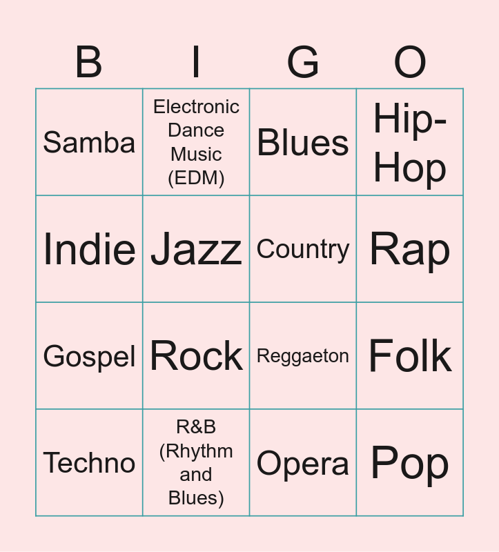 This bingo card has 25 words: Free!, Reggae, Rap, Rock ‘n’ Roll, Indie, Samba, Jazz, Electronic Dance Music (EDM), R&B (Rhythm and Blues), Heavy Metal, Gospel, Reggaeton, Latin, Punk, Country, Classical, Opera, Blues, Rock, Folk, Techno, Soul, Pop, Hip-Hop and K-Pop (Korean pop).