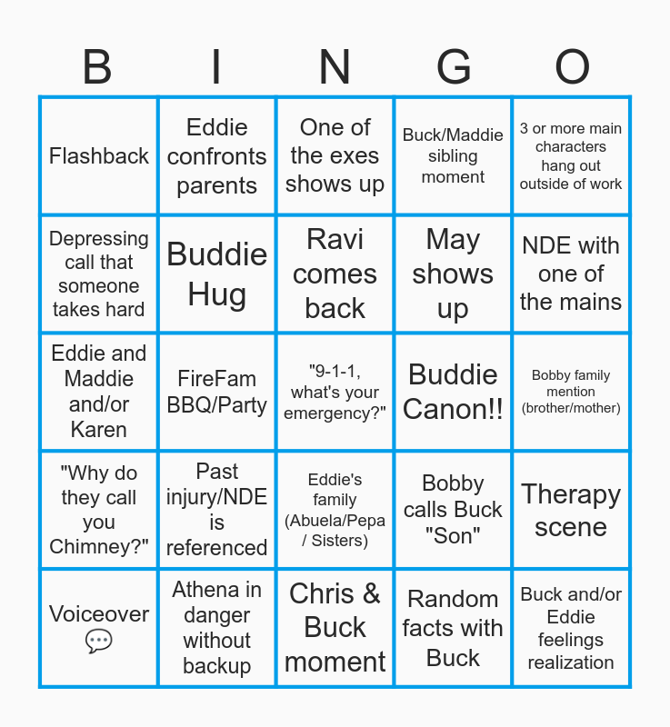 This bingo card has a free space and 24 words: Past injury/NDE is referenced, Athena in danger without backup, Ravi comes back, Voiceover 💬, 3 or more main characters hang out outside of work, Flashback, Depressing call that someone takes hard, Eddie confronts parents, Buddie Canon!!, Eddie's family (Abuela/Pepa / Sisters), May shows up, Eddie and Maddie and/or Karen, Bobby calls Buck "Son", Therapy scene, Buddie Hug, Random facts with Buck, Bobby family mention (brother/mother), One of the exes shows up, NDE with one of the mains, FireFam BBQ/Party, Buck and/or Eddie feelings realization, "Why do they call you Chimney?", Buck/Maddie sibling moment and Chris & Buck moment.