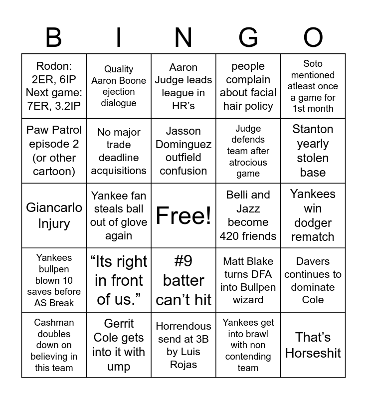 This bingo card has a free space and 24 words: “Its right in front of us.”, Gerrit Cole gets into it with ump, Jasson Dominguez outfield confusion, Cashman doubles down on believing in this team, Soto mentioned atleast once a game for 1st month, Rodon: 2ER, 6IP Next game: 7ER, 3.2IP, Paw Patrol episode 2 (or other cartoon), Quality Aaron Boone ejection dialogue, Belli and Jazz become 420 friends, #9 batter can’t hit, Judge defends team after atrocious game, Giancarlo Injury, Matt Blake turns DFA into Bullpen wizard, Davers continues to dominate Cole, No major trade deadline acquisitions, Yankees get into brawl with non contending team, Yankees win dodger rematch, Aaron Judge leads league in HR’s, Stanton yearly stolen base, Yankee fan steals ball out of glove again, That’s Horseshit, Yankees bullpen blown 10 saves before AS Break, people complain about facial hair policy and Horrendous send at 3B by Luis Rojas.