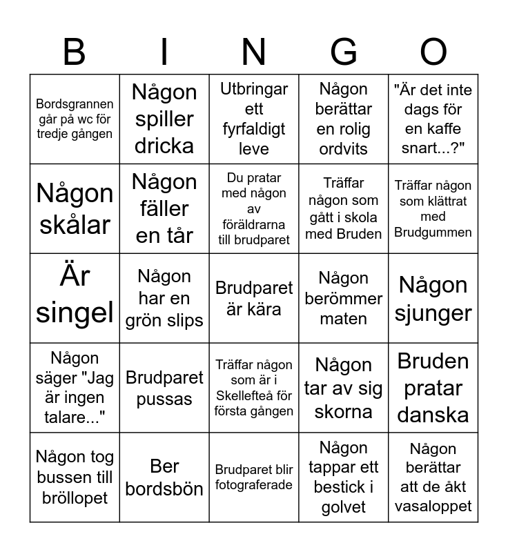 This bingo card has a free space and 24 words: Brudparet pussas, Ber bordsbön, Du pratar med någon av föräldrarna till brudparet, Någon tog bussen till bröllopet, "Är det inte dags för en kaffe snart...?", Bordsgrannen går på wc för tredje gången, Någon skålar, Någon spiller dricka, Någon berömmer maten, Träffar någon som är i Skellefteå för första gången, Träffar någon som gått i skola med Bruden, Är singel, Någon tar av sig skorna, Bruden pratar danska, Någon fäller en tår, Någon tappar ett bestick i golvet, Någon sjunger, Utbringar ett fyrfaldigt leve, Träffar någon som klättrat med Brudgummen, Någon har en grön slips, Någon berättar att de åkt vasaloppet, Någon säger "Jag är ingen talare...", Någon berättar en rolig ordvits and Brudparet blir fotograferade.