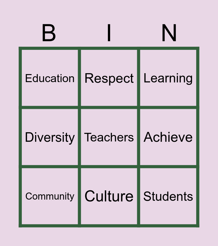This bingo card has 13 words: Free!, Community, Culture, Achieve, Education, Teachers, Students, Experiences, Strategies, Learning, Diversity, Respect and Quality.