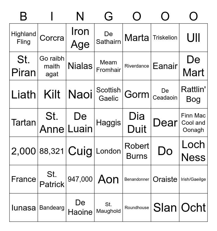 This bingo card has 111 words: Free!, Dublin, London, Belfast, Edinbrough, Cardiff, Douglas, England, Scotland, Wales, Northern Ireland, England, Scotland, Wales, France, England, Euro, Pound, Breton/Brezhoneg, Cornish/Kernewek, Irish/Gaeilge, Scottish Gaelic, Welsh/Cymraeg, Manx/Gaelg, Highland Cattle, Rattlin' Bog, Iron Age, Celtic Knot, Hilfort, Roundhouse, Kilt, Tartan, Robert Burns, Potato Famine, Highland Games, Highland Fling, Riverdance, Haggis, Giant's Causeway, Benandonner, Finn Mac Cool and Oonagh, Children of Lir, Tír na nÓg, the Land of Youth, Loch Ness, Shamrock, Emerald Isle, Dragon, St. Patrick, St. David, St. Piran, St. Andrew, St. Anne, St. Maughold, 1,887,437, 947,000, 356,000, 88,321, 2,000, 1,823, Cornish and Manx, Queen Boudicca, Triskelion, Gaulish, Ta se ag cur snechta!, Dia Duit, Maiden mhaith, Tráthnóna mhaith, Conas ata tu?, _________ is ainm dom., Le do thoil, Go raibh maith agat, tá fáilte romhat, Slan, Snechta, Ull, Nialas, Aon, Do, Tri, Caethair, Cuig, Se, Seacht, Ocht, Naoi, Deich, De Luain, De Mart, De Ceadaoin, Deardoain, De Haoine, De Sathairn, De Domhnaigh, Eanair, Feabhra, Marta, Aibrean, Bealtane, Meitheamh, Iuil, Iunasa, Meam Fromhair, Deireadh Fhomhair, Samhna, Nollag, Dear, Oraiste, Bui, Glas, Gorm, Corcra, Bandearg, Donn, Bandearg, Liath and Dubh.