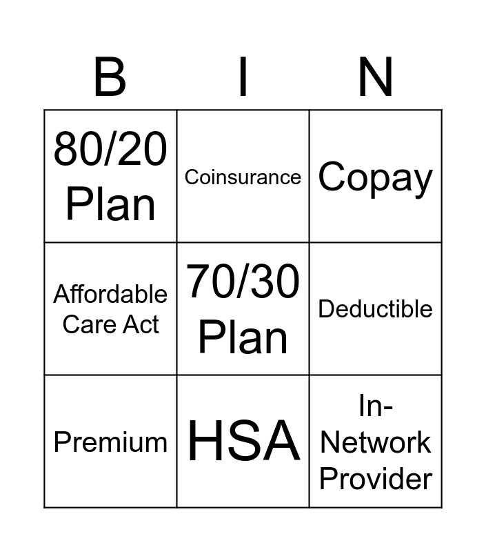 This bingo card has a free space and 8 words: Deductible, Copay, Coinsurance, Premium, 80/20 Plan, In-Network Provider, Affordable Care Act and HSA.