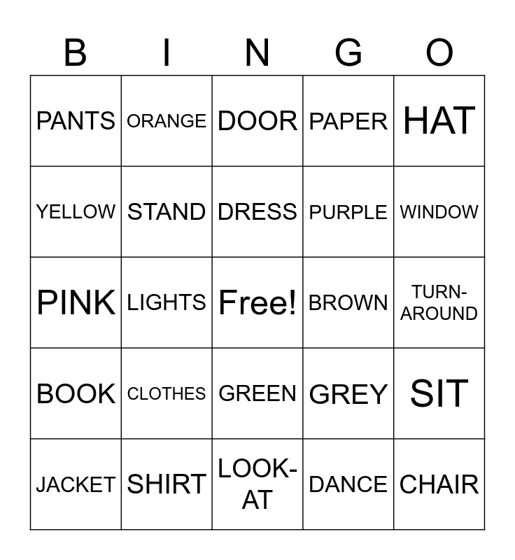 This bingo card has a free space and 24 words: CLOTHES, SHIRT, DRESS, JACKET, HAT, PANTS, YELLOW, ORANGE, BROWN, GREEN, PURPLE, PINK, GREY, SIT, STAND, DANCE, TURN-AROUND, DOOR, WINDOW, LIGHTS, CHAIR, BOOK, PAPER and LOOK-AT.