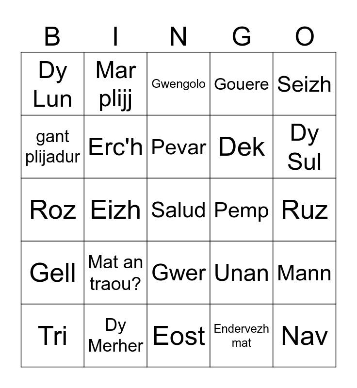 This bingo card has 53 words: Free!, Salud, Demat, Endervezh mat, Mat an traou?, _______ eo ma anv., Mar plijj, Trugarez, gant plijadur, Kenavo, Erc'h, Aval, Mann, Unan, Daou, Tri, Pevar, Pemp, C'hwec'h, Seizh, Eizh, Nav, Dek, Dy Lun, Dy Meurth, Dy Merher, Dy Yow, Dy Gwener, Dy Sadorn, Dy Sul, Genver, C'hwevrer, Meurzh, Ebrel, Mae, Mezheren, Gouere, Eost, Gwengolo, Here, Du, Kerzu, Ruz, Oranjez, Melen, Gwer, Glas, Mouk, Roz, Gell, Gwenn, Louet and Du.