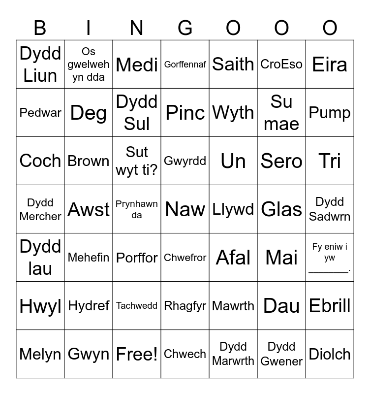 This bingo card has 53 words: Free!, Su mae, Bore da, Prynhawn da, Sut wyt ti?, Fy eniw i yw ________., Os gwelweh yn dda, Diolch, CroEso, Hwyl, Eira, Afal, Sero, Un, Dau, Tri, Pedwar, Pump, Chwech, Saith, Wyth, Naw, Deg, Dydd Liun, Dydd Marwrth, Dydd Mercher, Dydd lau, Dydd Gwener, Dydd Sadwrn, Dydd Sul, Ionwar, Chwefror, Mawrth, Ebrill, Mai, Mehefin, Gorffennaf, Awst, Medi, Hydref, Tachwedd, Rhagfyr, Coch, Oren, Melyn, Gwyrdd, Glas, Porffor, Pinc, Brown, Gwyn, Llywd and Du.
