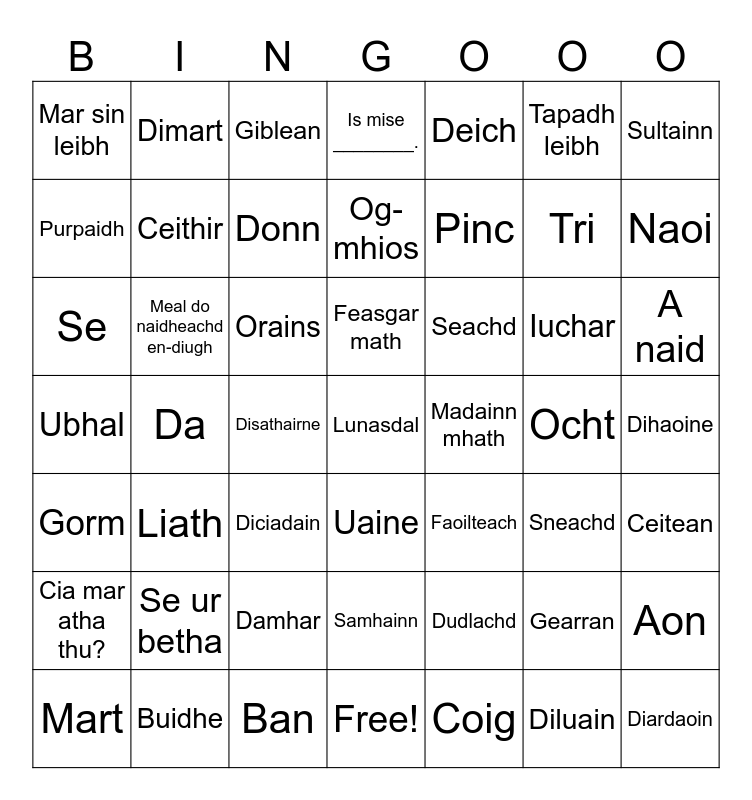 This bingo card has 54 words: Free!, Meal do naidheachd en-diugh, Halo, Madainn mhath, Feasgar math, Cia mar atha thu?, Is mise ________., Mas e ur toile, Tapadh leibh, Se ur betha, Mar sin leibh, Sneachd, Ubhal, A naid, Aon, Da, Tri, Ceithir, Coig, Se, Seachd, Ocht, Naoi, Deich, Diluain, Dimart, Diciadain, Diardaoin, Dihaoine, Disathairne, Didomhnaich, Faoilteach, Gearran, Mart, Giblean, Ceitean, Og-mhios, Iuchar, Lunasdal, Sultainn, Damhar, Samhainn, Dudlachd, Dearg, Orains, Buidhe, Uaine, Gorm, Purpaidh, Pinc, Donn, Ban, Liath and Dubh.