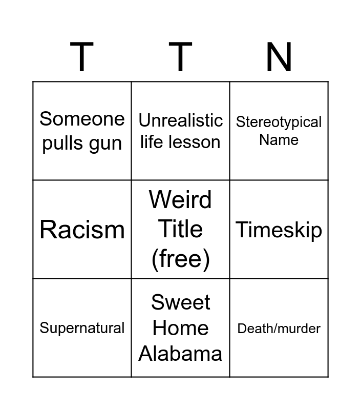 This bingo card has a free space and 8 words: Timeskip, Stereotypical Name, Unrealistic life lesson, Supernatural, Someone pulls gun, Death/murder, Racism and Sweet Home Alabama.
