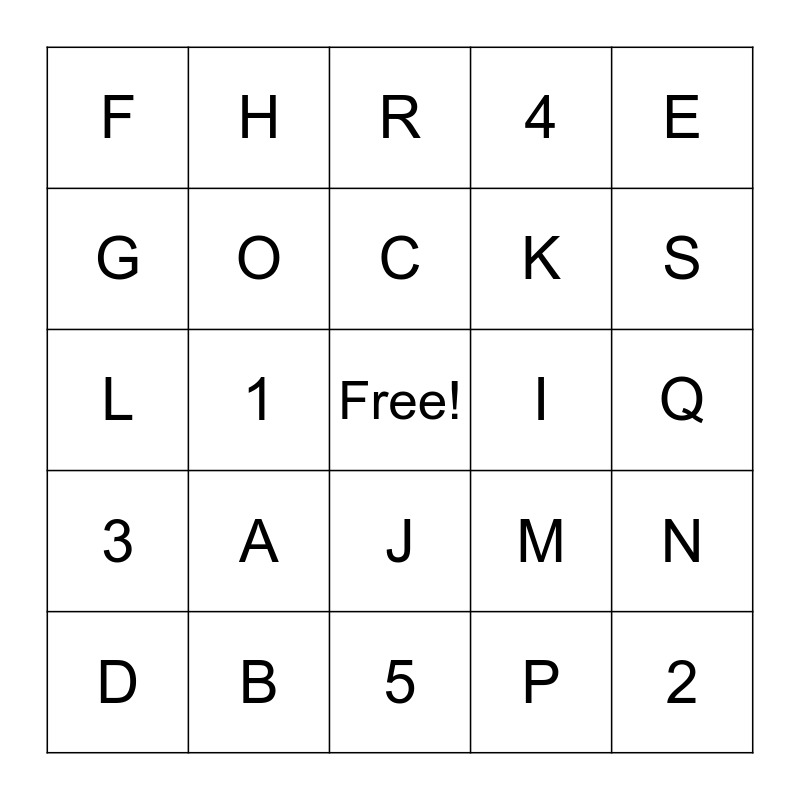 This bingo card has a free space and 24 words: A, B, C, D, E, F, G, H, I, J, K, L, M, N, O, P, Q, R, S, 1, 2, 3, 4 and 5.