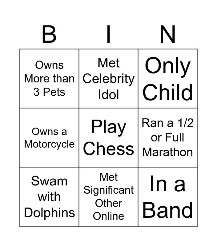 This bingo card has 18 words: Been to Cuba, Keeps a Journal, Only Child, Owns More than 3 Pets, Has been Deep Sea Fishing, Owns a Motorcycle, Has Traveled to Europe, Met Celebrity Idol, Met Significant Other Online, In a Band, Played a college sport, Play Chess, Been an extra on Camera, Ran a 1/2 or Full Marathon, Swam with Dolphins, Been to the Mount Rushmore, Been on a College Field after Big Win and Been to Comic Con.