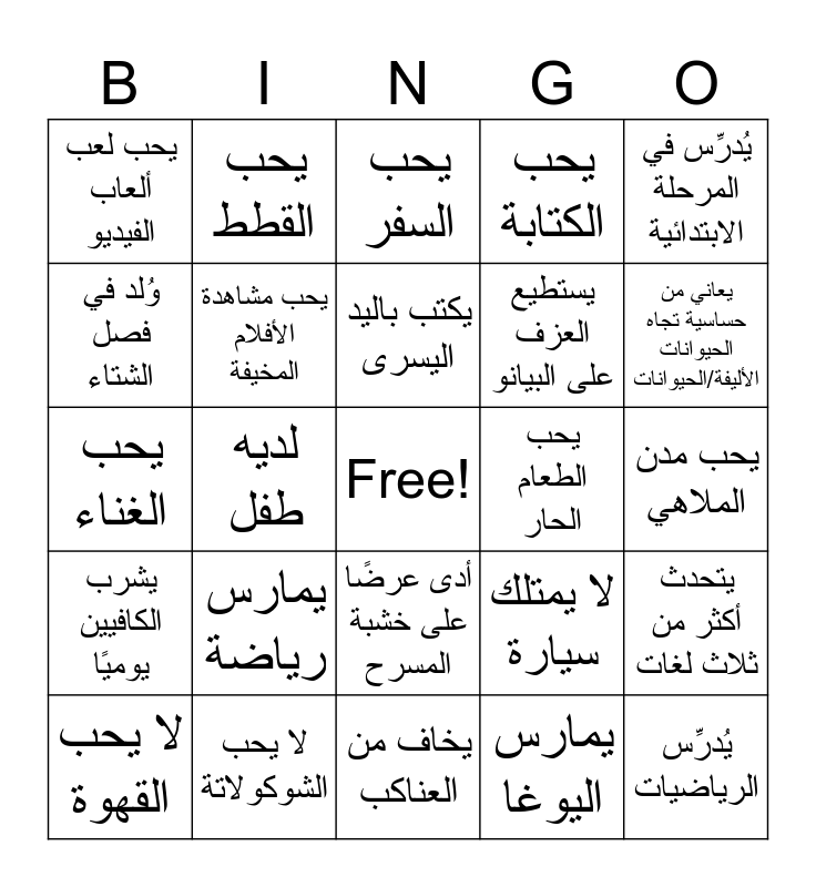 This bingo card has a free space and 32 words: يمارس اليوغا, زار أكثر من ثلاث قارات, لديه طفل, يُدرِّس في المرحلة الثانوية, يشرب الكافيين يوميًا, يحب مشاهدة الأفلام المخيفة, يُدرِّس في المرحلة الابتدائية, يتحدث أكثر من ثلاث لغات, يحب القطط, يكره الكلاب, يكتب باليد اليسرى, يحب السفر, يحب القراءة, قابل أحد المشاهير, يحب الطعام الحار, يُدرِّس اللغة العربية, لا يحب القهوة, يحب الغناء, أدى عرضًا على خشبة المسرح, يمارس رياضة, لا يمتلك سيارة, هو الابن الوحيد (ليس لديه إخوة أو أخوات), يحب مدن الملاهي, لا يحب الشوكولاتة, يُدرِّس الرياضيات, يحب الكتابة, يستطيع العزف على البيانو, وُلد في فصل الشتاء, يحب لعب ألعاب الفيديو, يخاف من العناكب, يستطيع العزف على آلة موسيقية and يعاني من حساسية تجاه الحيوانات الأليفة/الحيوانات.