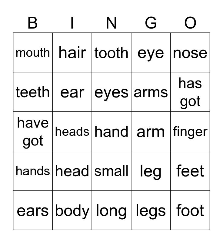 This bingo card has a free space and 24 words: head, body, eyes, ears, nose, mouth, teeth, hair, arm, small, arms, have got, leg, feet, ear, legs, finger, tooth, has got, heads, foot, hands, eye and long.