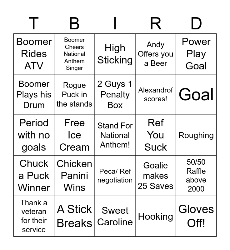 This bingo card has a free space and 24 words: Chicken Panini Wins, A Stick Breaks, 2 Guys 1 Penalty Box, Thank a veteran for their service, Power Play Goal, Boomer Rides ATV, Boomer Plays his Drum, Boomer Cheers National Anthem Singer, Ref You Suck, Peca/ Ref negotiation, Alexandrof scores!, Period with no goals, Goalie makes 25 Saves, 50/50 Raffle above 2000, Rogue Puck in the stands, Hooking, Roughing, High Sticking, Goal, Free Ice Cream, Gloves Off!, Chuck a Puck Winner, Andy Offers you a Beer and Sweet Caroline.