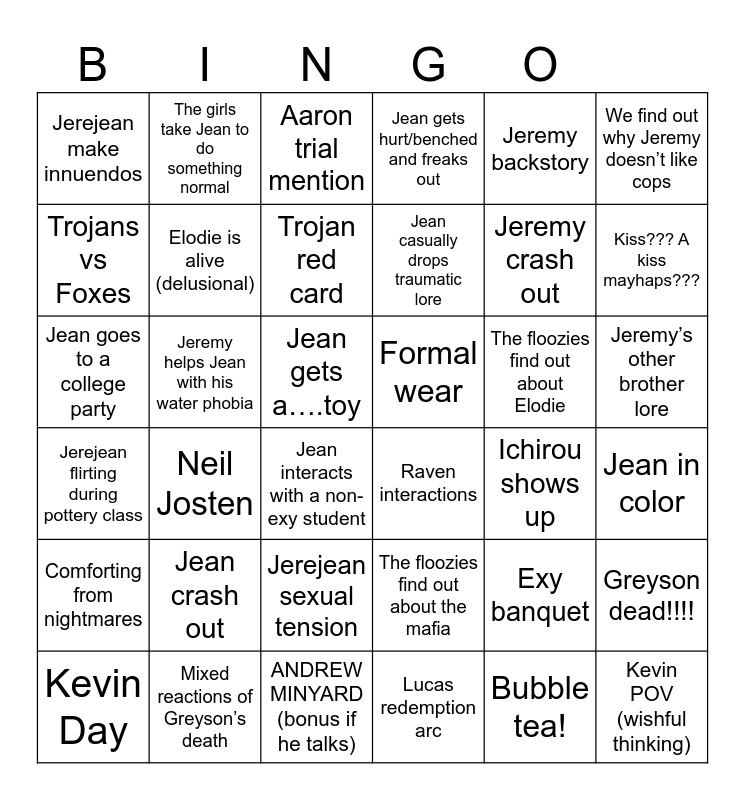 This bingo card has 36 words: The floozies find out about the mafia, Jerejean sexual tension, Lucas redemption arc, Trojans vs Foxes, Jerejean flirting during pottery class, Formal wear, Elodie is alive (delusional), ANDREW MINYARD (bonus if he talks), Jeremy backstory, Exy banquet, Kiss??? A kiss mayhaps???, Jean gets hurt/benched and freaks out, Greyson dead!!!!, Jeremy helps Jean with his water phobia, Jean casually drops traumatic lore, Jerejean make innuendos, Comforting from nightmares, The floozies find out about Elodie, Jean goes to a college party, Aaron trial mention, Jean gets a….toy, Neil Josten, Raven interactions, Jean interacts with a non-exy student, Ichirou shows up, The girls take Jean to do something normal, Jeremy crash out, Mixed reactions of Greyson’s death, Trojan red card, We find out why Jeremy doesn’t like cops, Kevin POV (wishful thinking), Kevin Day, Jean in color, Jeremy’s other brother lore, Jean crash out and Bubble tea!.