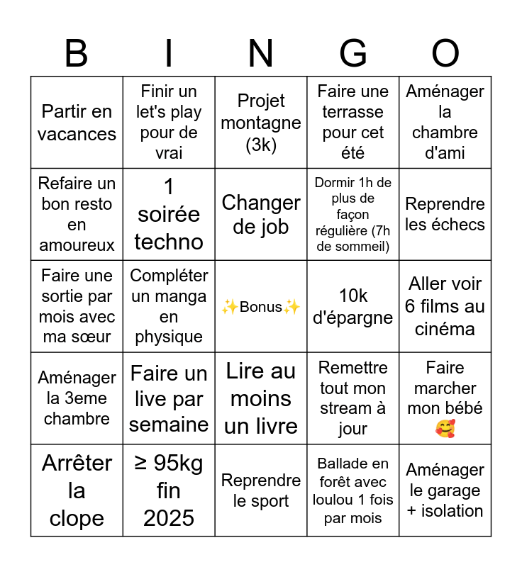 This bingo card has a free space and 24 words: Faire un live par semaine, ≥ 95kg fin 2025, Changer de job, Arrêter la clope, Aménager la chambre d'ami, Partir en vacances, Refaire un bon resto en amoureux, Finir un let's play pour de vrai, 10k d'épargne, Lire au moins un livre, Dormir 1h de plus de façon régulière (7h de sommeil), Faire une sortie par mois avec ma sœur, Remettre tout mon stream à jour, Faire marcher mon bébé 🥰, 1 soirée techno, Ballade en forêt avec loulou 1 fois par mois, Aller voir 6 films au cinéma, Projet montagne (3k), Reprendre les échecs, Compléter un manga en physique, Aménager le garage + isolation, Aménager la 3eme chambre, Faire une terrasse pour cet été and Reprendre le sport.