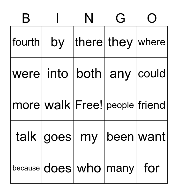 This bingo card has a free space and 34 words: one, many, says, woman, talk, into, where, because, by, should, both, there, would, two, people, could, does, more, goes, been, my, forty, fourth, friend, who, for, they, four, any, were, once, walk, want and move.