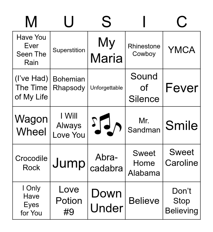 This bingo card has a free space and 46 words: Beat It, Don’t Stop Believing, Girls Just Want to Have Fun, Down Under, Jump, Stayin’ Alive, Superstition, Dreams, (I’ve Had) The Time of My Life, Rocket Man, Bohemian Rhapsody, Rhinestone Cowboy, Sweet Caroline, Sweet Home Alabama, Dancing Queen, Goodnight Irene, Unforgettable, Mr. Sandman, I Want to Hold Your Hand, YMCA, I Will Always Love You, Believe, Have You Ever Seen The Rain, Sound of Silence, Come Fly With Me, Fever, I Only Have Eyes for You, Brown Eyed Girl, Abra-cadabra, Crocodile Rock, Uptown Girl, It’s Not Unusual, You Sexy Thing, Suspicious Minds, Shake Rattle & Roll, Love Potion #9, Smile, Swinging on a Star, Honky Tonk Blues, Bad Bad Leroy Brown, If I Die Young, My Maria, Wagon Wheel, Ring of Fire, Delta Dawn and Your Cheatin’ Heart.