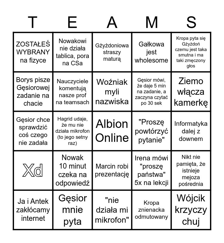 This bingo card has a free space and 24 words: Nowak 10 minut czeka na odpowiedź, Gęsior mnie pyta, Woźniak myli nazwiska, Ja i Antek zakłócamy internet, Kropa pyta się Gżyżdoń czemu jest taka smutna i ma taki zmęczony głos, ZOSTAŁEŚ WYBRANY na fizyce, Borys pisze Gęsiorowej zadanie na chacie, Nowakowi nie działa tablica, pora na CSa, "Proszę powtórzyć pytanie", Marcin robi prezentację, Gęsior mówi, że daje 5 min na zadanie, a zaczyna czytać po 30 sek, Gęsior chce sprawdzić coś czego nie zadała, Irena mówi "proszę państwa" 5x na lekcji, Nikt nie pamięta, że istnieje mejoza pośrednia, Nauczyciele komentują nasze prof na teamsach, Kropa znienacka odmutowany, Informatyka dalej z downem, Gżyżdoniowa straszy maturą, Ziemo włącza kamerkę, Hagrid udaje, że mu nie działa mikrofon (to jego setny raz), Wójcik krzyczy chuj, Xd, Gałkowa jest wholesome and "nie działa mi mikrofon".