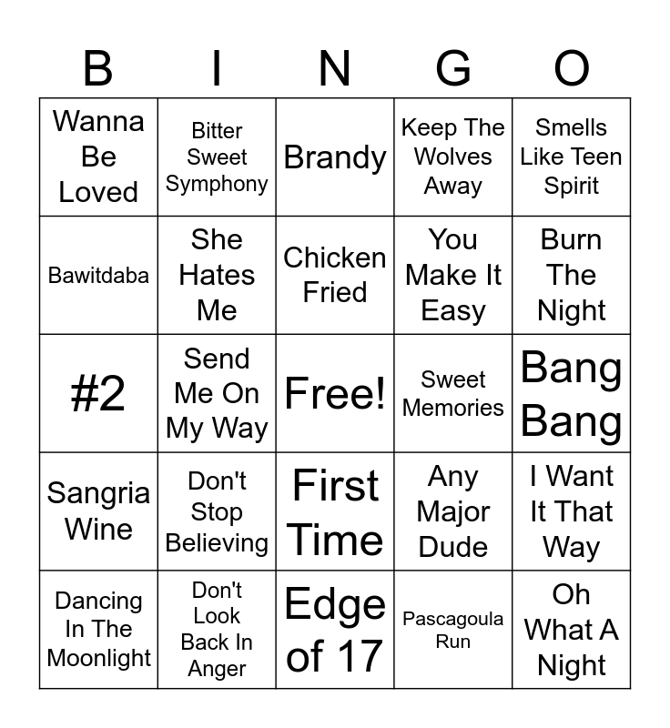 This bingo card has a free space and 43 words: California Girls, Oh What A Night, You Go Your Way, Dancing In The Moonlight, The Life, Pascagoula Run, Brandy, Like A Stone, Smells Like Teen Spirit, Don't Look Back In Anger, Keep The Wolves Away, Sweet Memories, First Time, Don't Stop Believing, Dream On, Edge of 17, WAP, #2, #3, Burn The Night, Bitter Sweet Symphony, Everywhere, Pink Skies, Wanna Be Loved, Pink Pony Club, Bang Bang, Too Close, Brain Damage, Any Major Dude, Sangria Wine, Set Adrift On Memory Bliss, I Want It That Way, #41, Send Me On My Way, So Fly, Red Barchetta, Summer Song, Chicken Fried, Bawitdaba, You Make It Easy, Somebody That I Used To Know, She Hates Me and Broken.