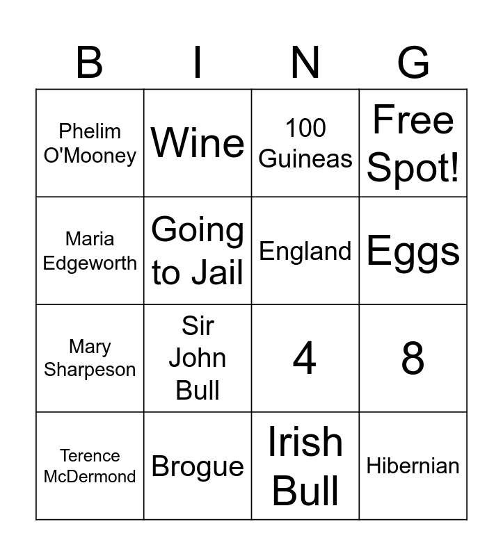 This bingo card has 16 words: Brogue, 8, 100 Guineas, Phelim O'Mooney, Mary Sharpeson, Wine, 4, Irish Bull, Maria Edgeworth, Going to Jail, Terence McDermond, Free Spot!, Sir John Bull, Eggs, England and Hibernian.