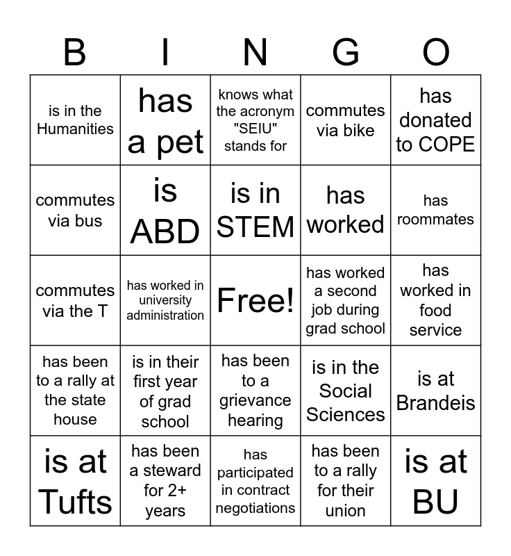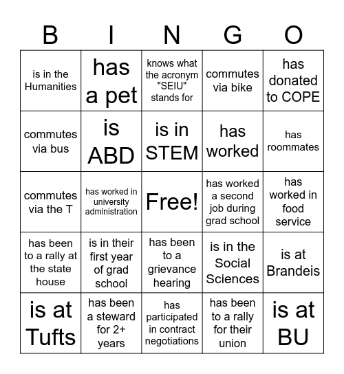This bingo card has a free space and 24 words: is in their first year of grad school, has been a steward for 2+ years, is in STEM, is at Tufts, has donated to COPE, is in the Humanities, commutes via bus, has a pet, has worked a second job during grad school, has been to a grievance hearing, has worked, commutes via the T, is in the Social Sciences, is at Brandeis, is ABD, has been to a rally for their union, has worked in food service, knows what the acronym "SEIU" stands for, has roommates, has worked in university administration, is at BU, has been to a rally at the state house, commutes via bike and has participated in contract negotiations.