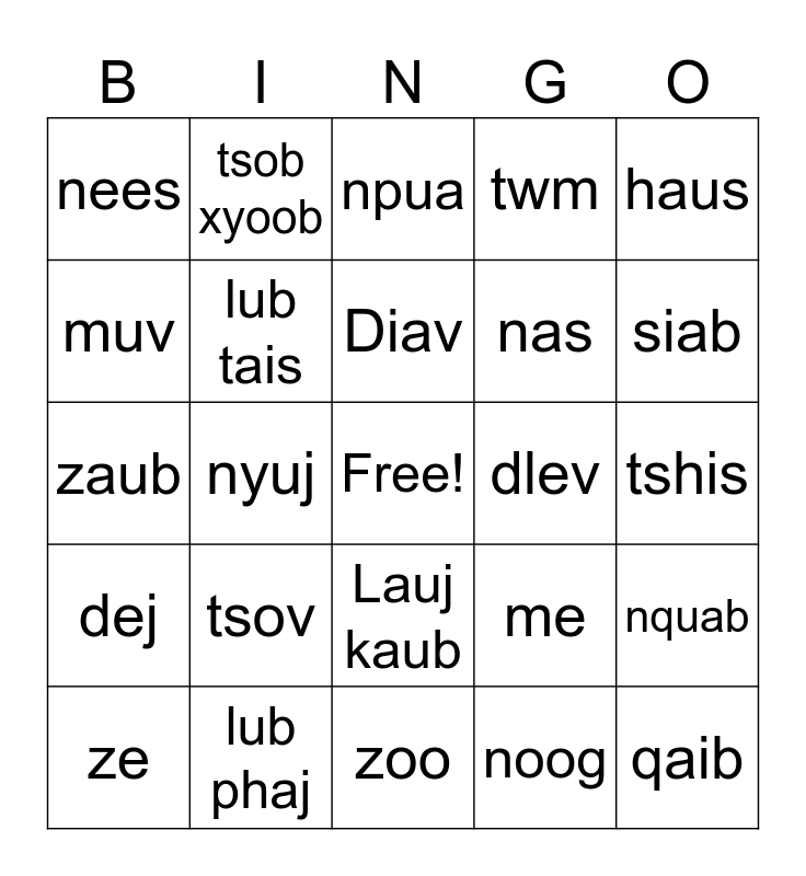 This bingo card has a free space and 40 words: mov, zaub, nqaij, lub tais, lub phaj, Lauj kaub, Diav, noj, haus, dej, nyuj, twm, qaib, tshis, dlev, tsov, ntxhw, nees, dais, npua, nquab, noog, nas, muv, liab, niam, txiv, xib hwb, tsheb, caij, dleb, ze, loj, me, siab, zoo, phem, tsob ntoo, tsob xyoob and hma.