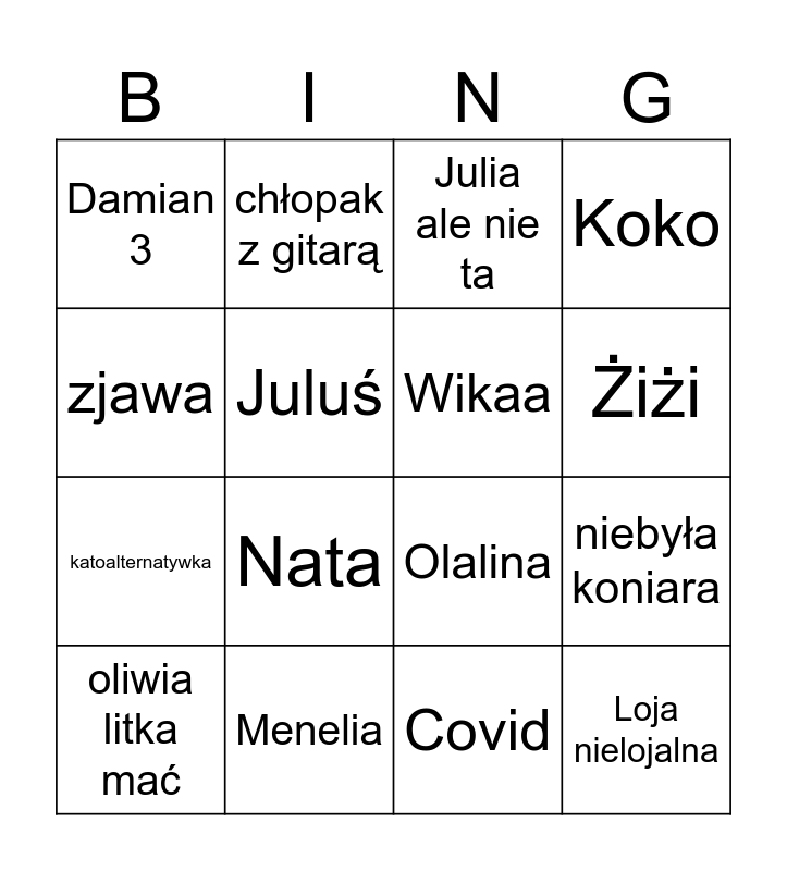 This bingo card has 16 words: Menelia, niebyła koniara, Julia ale nie ta, Damian 3, katoalternatywka, chłopak z gitarą, Olalina, Covid, zjawa, Juluś, oliwia litka mać, Koko, Nata, Żiżi, Wikaa and Loja nielojalna.