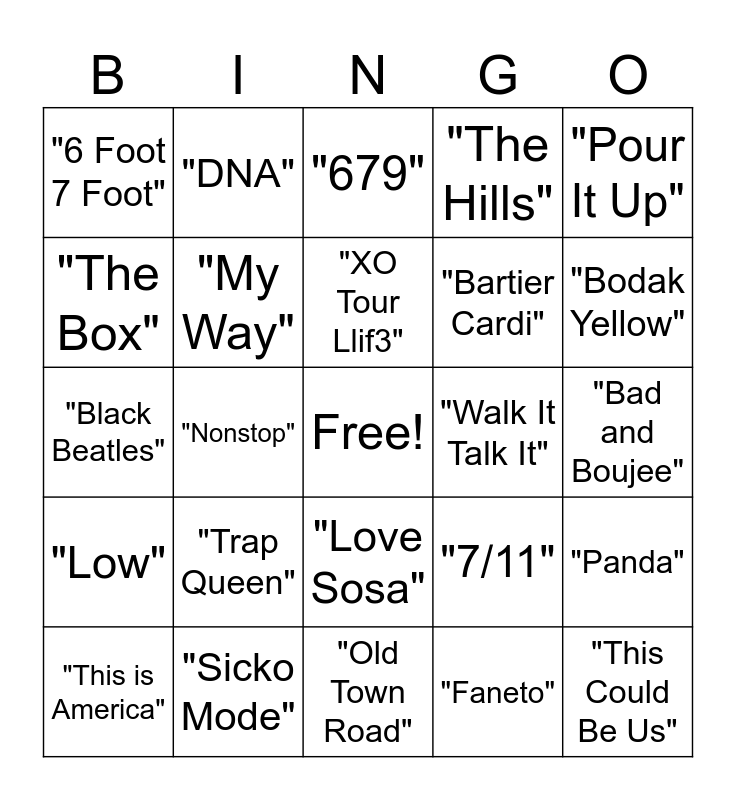 This bingo card has a free space and 24 words: "Trap Queen", "Sicko Mode", "XO Tour Llif3", "This is America", "Pour It Up", "6 Foot 7 Foot", "The Box", "DNA", "Walk It Talk It", "Love Sosa", "Bartier Cardi", "Black Beatles", "7/11", "Panda", "My Way", "Faneto", "Bad and Boujee", "679", "Bodak Yellow", "Nonstop", "This Could Be Us", "Low", "The Hills" and "Old Town Road".