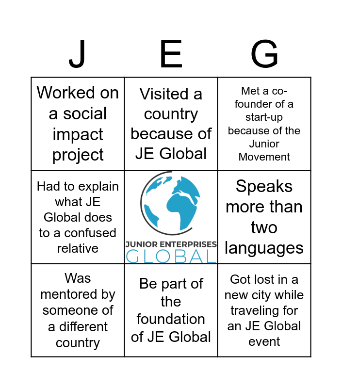 This bingo card has a free space and 8 words: Speaks more than two languages, Met a co-founder of a start-up because of the Junior Movement, Visited a country because of JE Global, Was mentored by someone of a different country, Worked on a social impact project, Got lost in a new city while traveling for an JE Global event, Had to explain what JE Global does to a confused relative and Be part of the foundation of JE Global.